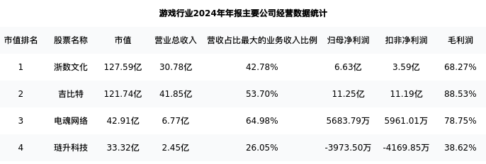 浙数文化最新报告期数据为年报,下表汇总了游戏行业内市值靠前的公司年报主要经营数据