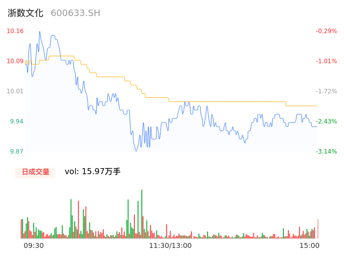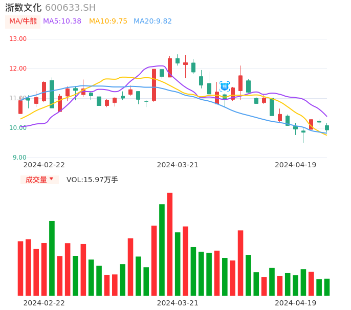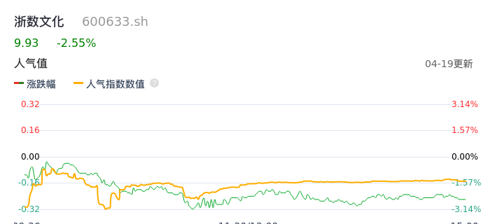 04月19日,浙数文化收报9.93,股价涨幅-2.55%,成交金额1.59亿元,换手率1.26%。
