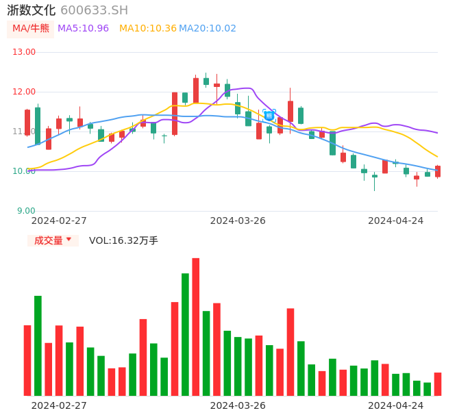 04月24日,浙数文化收报10.13,股价涨幅2.63%,成交金额1.64亿元,换手率1.29%。