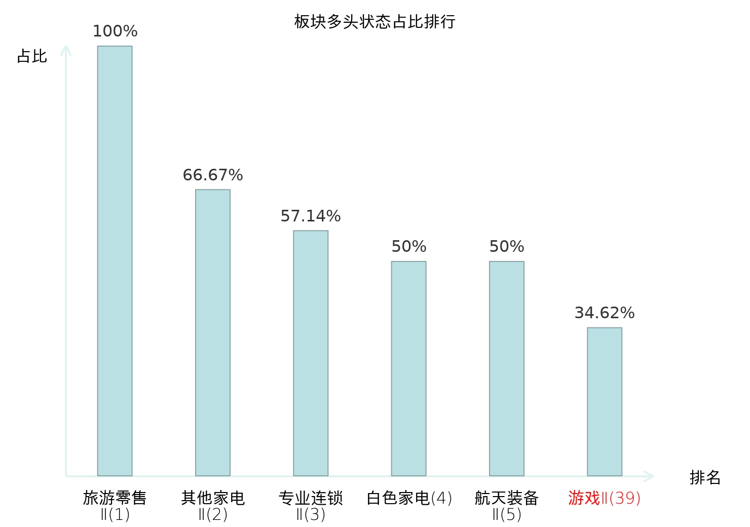 全市场所有行业板块中主力多头状态占比排名中,旅游零售Ⅱ板块位居第一。股份制银行Ⅱ板块名次提升最快,较昨日上升79位。