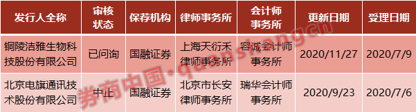 Wind数据显示,目前国融证券共有两个创业板项目正在进行中,分别是电旗股份和洁雅股份,审核状态分别为中止审查和已问询。