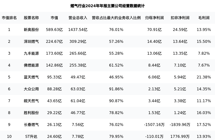 大众公用最新报告期数据为年报,下表汇总了燃气行业内市值靠前的公司年报主要经营数据