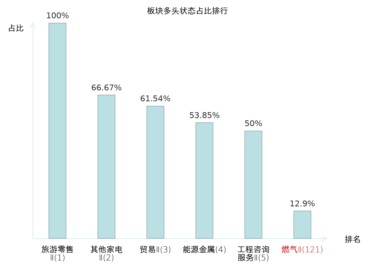 全市场所有行业板块中主力多头状态占比排名中,旅游零售Ⅱ板块位居第一。冶钢原料板块名次提升最快,较昨日上升37位。