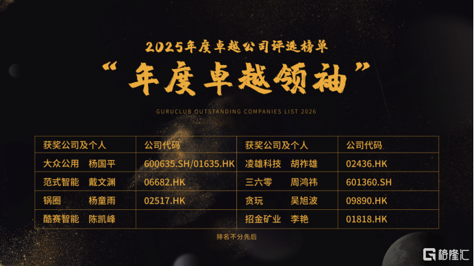 12月22日,格隆汇在线上举办"科技赋能·资本破局"分享会。本次分享会,备受瞩目的卓越公司评选榜单将隆重揭晓,其中格隆汇“金格奖”年度卓越公司评选中,大众公用(600635.SH/01635.HK)杨国平、范式智能(06682.HK)戴文渊、锅圈(02517.HK)杨童雨、酷赛智能 陈凯峰、凌雄科技(02436.HK)胡祚雄、 三六零(601360.SH)周鸿祎、贪玩(09890.HK)吴旭波、招金矿业(01818.HK)李艳8位荣获“年度卓越领袖”奖项。(排名不分先后,按公司首部字母顺序排列)
