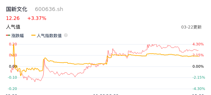 03月22日,国新文化收报12.26,股价涨幅3.37%,成交金额5.32亿元,换手率10.07%。