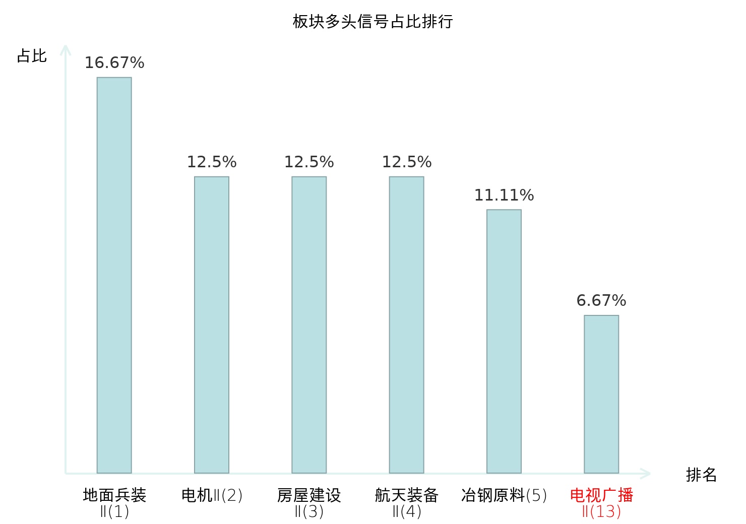 全市场所有行业板块中主力多头信号占比排名中,地面兵装Ⅱ板块位居第一。房屋建设Ⅱ板块名次提升最快,较昨日上升115位。