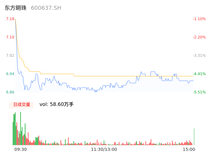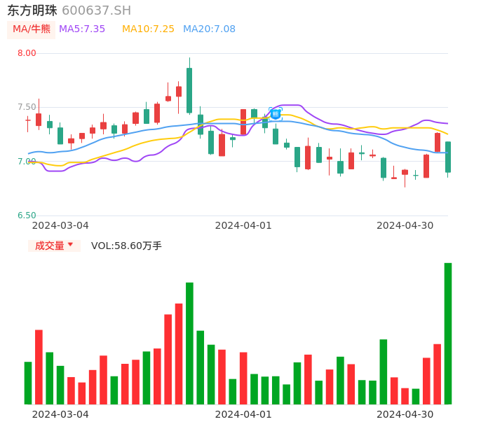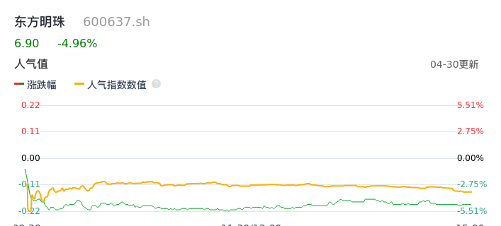 04月30日,东方明珠收报6.90,股价涨幅-4.96%,成交金额4.06亿元,换手率1.74%。