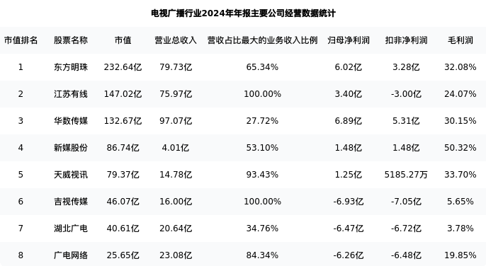 东方明珠最新报告期数据为年报,下表汇总了电视广播行业内市值靠前的公司年报主要经营数据