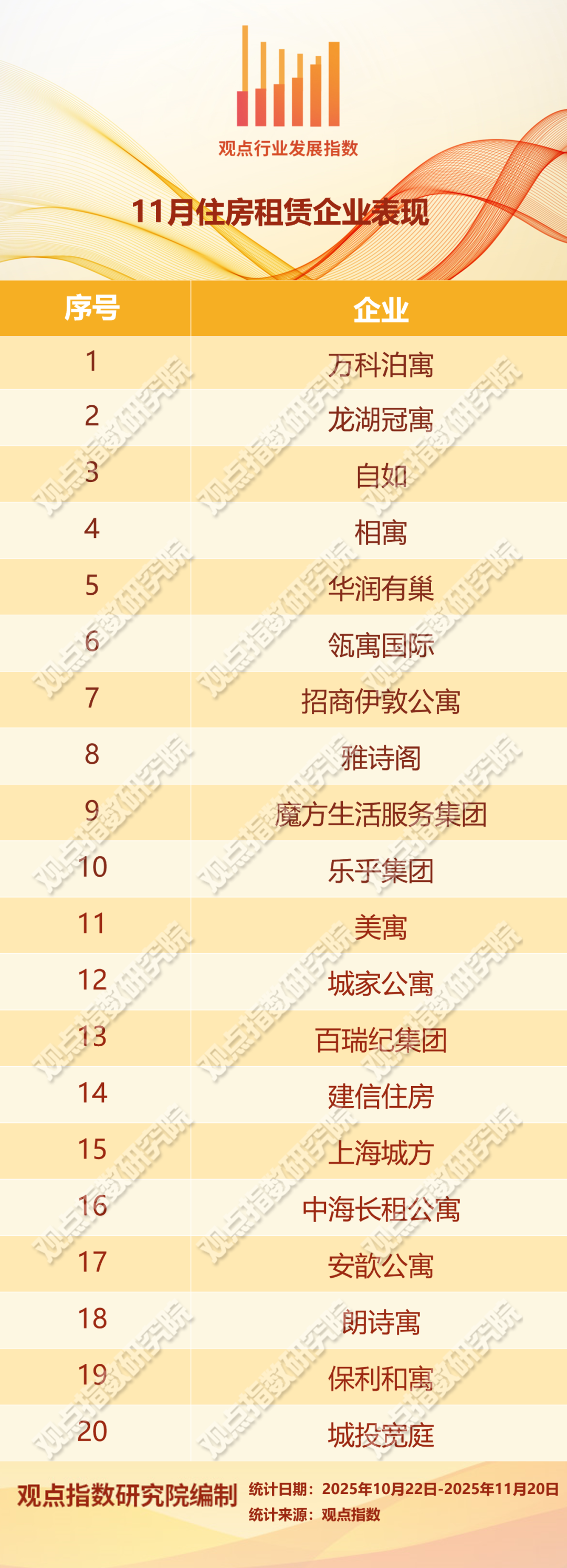 据观点指数不完全统计,2025年10-11月中央及地方主要聚焦于政策指引、管理规范、市场供给、存量盘活、权益保障等方面,出台新规或举办相关工作会议,以推动住房租赁市场的发展。