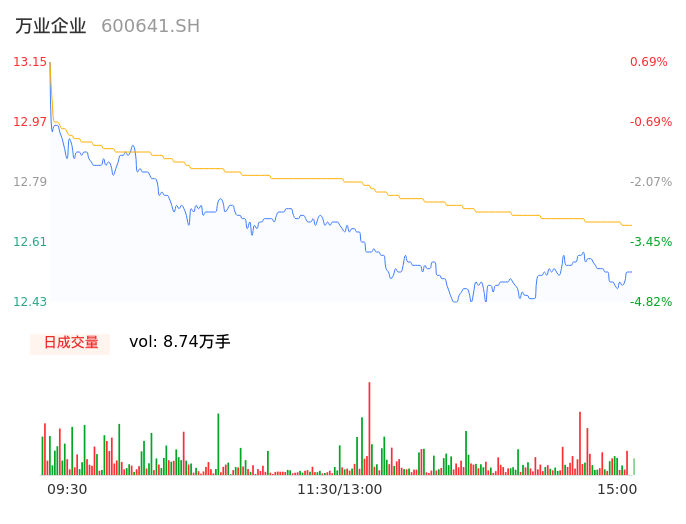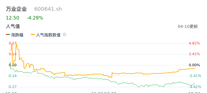 04月10日,万业企业收报12.50,股价涨幅-4.29%,成交金额1.11亿元,换手率0.94%。