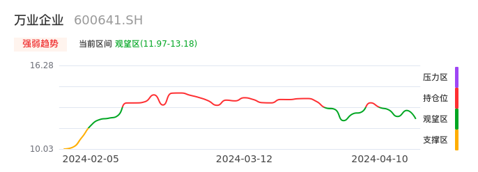 我们来看一下该股的九方特色指标强弱趋势的情况:万业企业自04月02日从持仓区下穿到观望区,股价近期持续走弱。短期已经进入空头行情,且下跌动能仍未衰竭。建议继续谨慎观望。