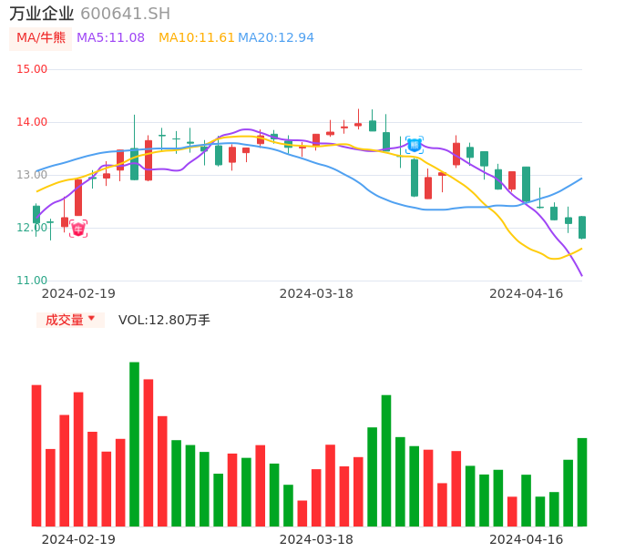 04月16日,万业企业收报11.80,股价涨幅-2.32%,成交金额1.54亿元,换手率1.38%。