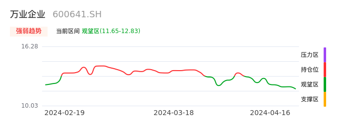 我们来看一下该股的九方特色指标强弱趋势的情况:万业企业自04月02日从持仓区下穿到观望区,股价近期持续走弱。短期已经进入空头行情,且下跌动能仍未衰竭。建议继续谨慎观望。