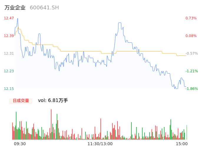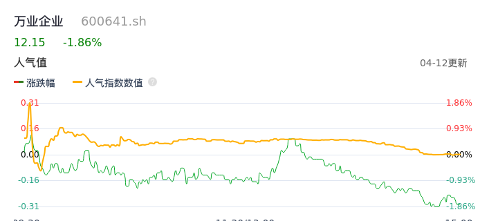 04月12日,万业企业收报12.15,股价涨幅-1.86%,成交金额8380.47万元,换手率0.73%。