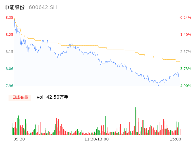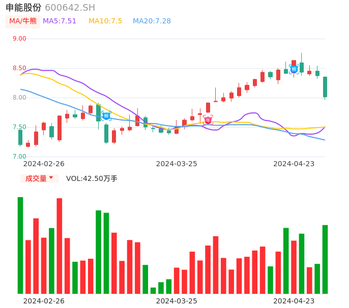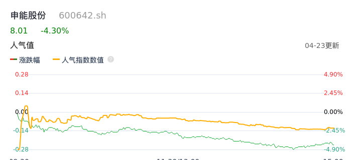 04月23日,申能股份收报8.01,股价涨幅-4.30%,成交金额3.44亿元,换手率0.87%。