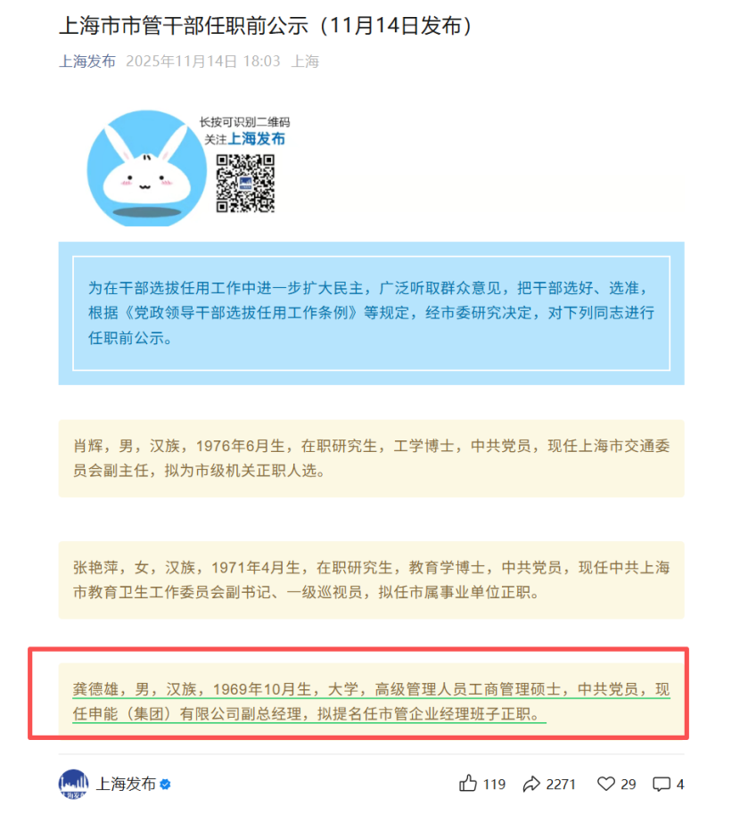 任前公示显示,龚德雄,男,汉族,1969年10月生,大学,高级管理人员工商管理硕士,中共党员,现任申能(集团)有限公司副总经理,拟提名任市管企业经理班子正职。