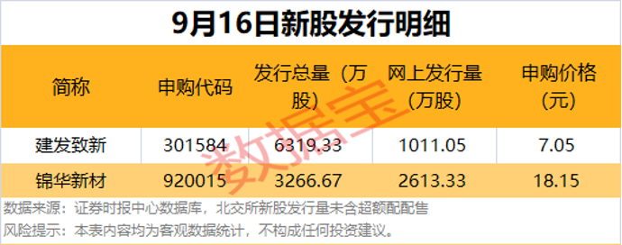 今日(9月16日)共有2只新股申购,分别为创业板的建发致新,北交所的锦华新材。