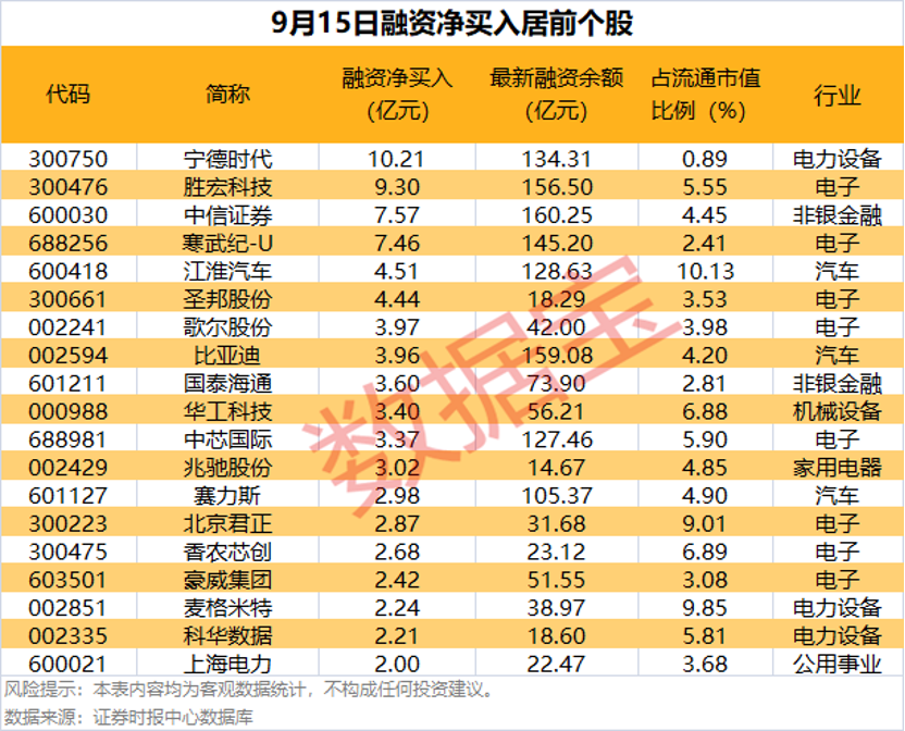具体到个股,9月15日获融资净买均超1亿元的共有49股。宁德时代融资净买入额居首,当日净买入10.21亿元;其次是胜宏科技中信证券,融资净买入金额分别为9.30亿元、7.57亿元。融资净买入金额居前的还有寒武纪-U、江淮汽车圣邦股份等。