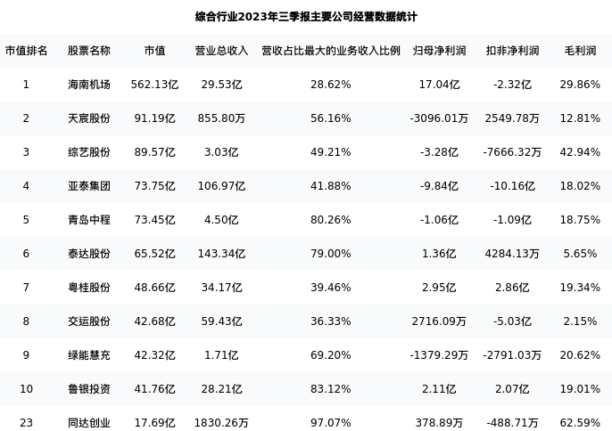 同达创业最新报告期数据为三季报,下表汇总了综合行业内市值靠前的公司三季报主要经营数据