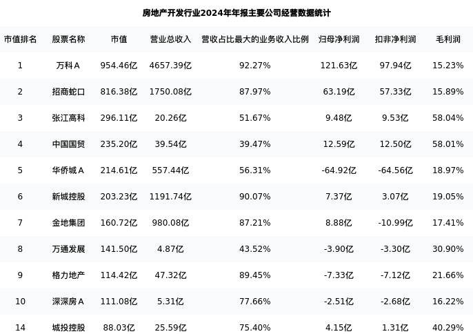 城投控股最新报告期数据为年报,下表汇总了房地产开发行业内市值靠前的公司年报主要经营数据