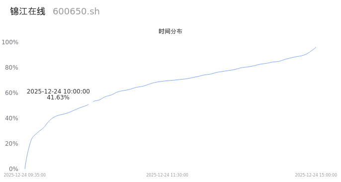 600650锦江在线2025年12月24日成交13.71万手,成交金额2.15亿,相较昨日缩量5.11万手,换手率3.51%,成交清淡。