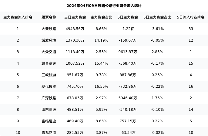 从主力资金流向来看,铁路公路行业今日主力资金流入9.31亿元,在所有申万二级行业中排名:5/131。