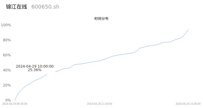 600650锦江在线2024年04月29日成交3.39万手,成交金额2613.32万元,相较昨日放量2044手,换手率0.87%,成交清淡。