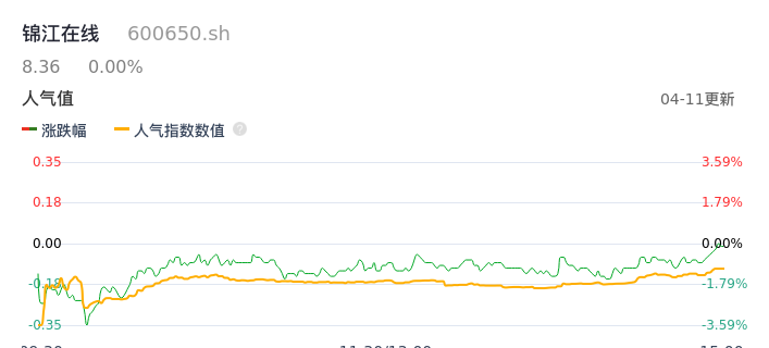04月11日,锦江在线收报8.36,股价涨幅0.00%,成交金额7608.63万元,换手率2.36%。