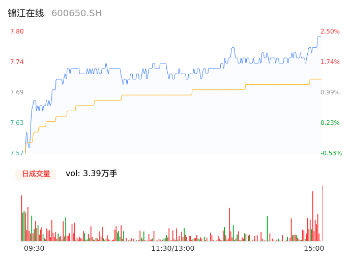 04月29日,锦江在线收报7.80,股价涨幅2.50%,成交金额2613.32万元,换手率0.87%。