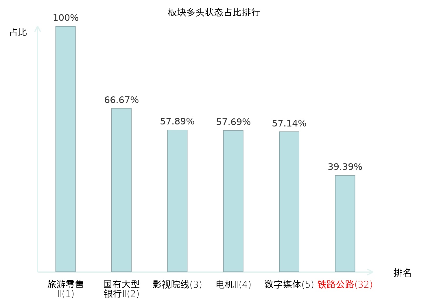 全市场所有行业板块中主力多头状态占比排名中,旅游零售Ⅱ板块位居第一。专业连锁Ⅱ板块名次提升最快,较昨日上升56位。