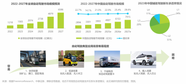 近年来,我国自动驾驶技术取得了显著进步,在矿山港口等封闭场景、低速配送场景、干线物流和载人场景等领域的渗透率不断提升。当前,国内量产乘用车的自动驾驶等级正从L2向L3+级别过渡。根据中泰证券预测,2023年我国在售新车L2渗透率达51%,L3和L4渗透率分别为20%和11%。在自动驾驶技术不断进步应用场景不断拓展背景下,中国自动驾驶市场规模保持高速增长,2023年已超3300亿元。预计未来,随着自动驾驶技术的进一步成熟和成本的不断降低,自动驾驶汽车的渗透率有望继续提高,市场规模也将保持20%以上速度持续快速攀升。
