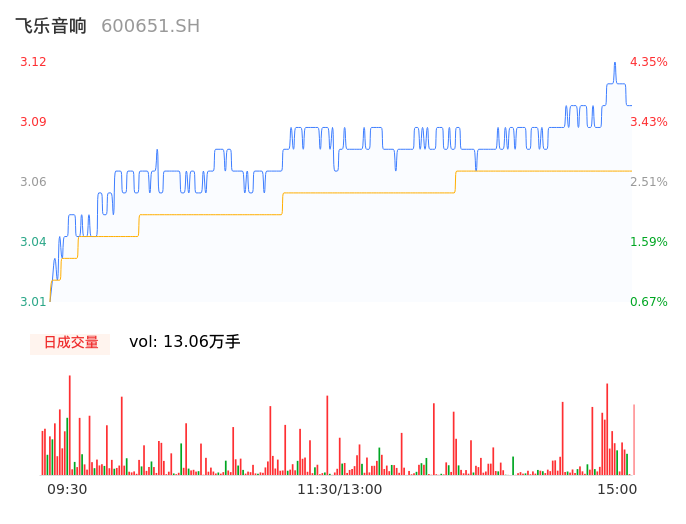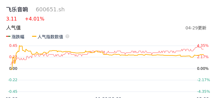 04月29日,飞乐音响收报3.11,股价涨幅4.01%,成交金额4012.95万元,换手率0.52%。