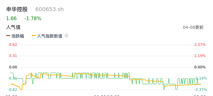 04月08日,申华控股收报1.66,股价涨幅-1.78%,成交金额1902.45万元,换手率0.59%。