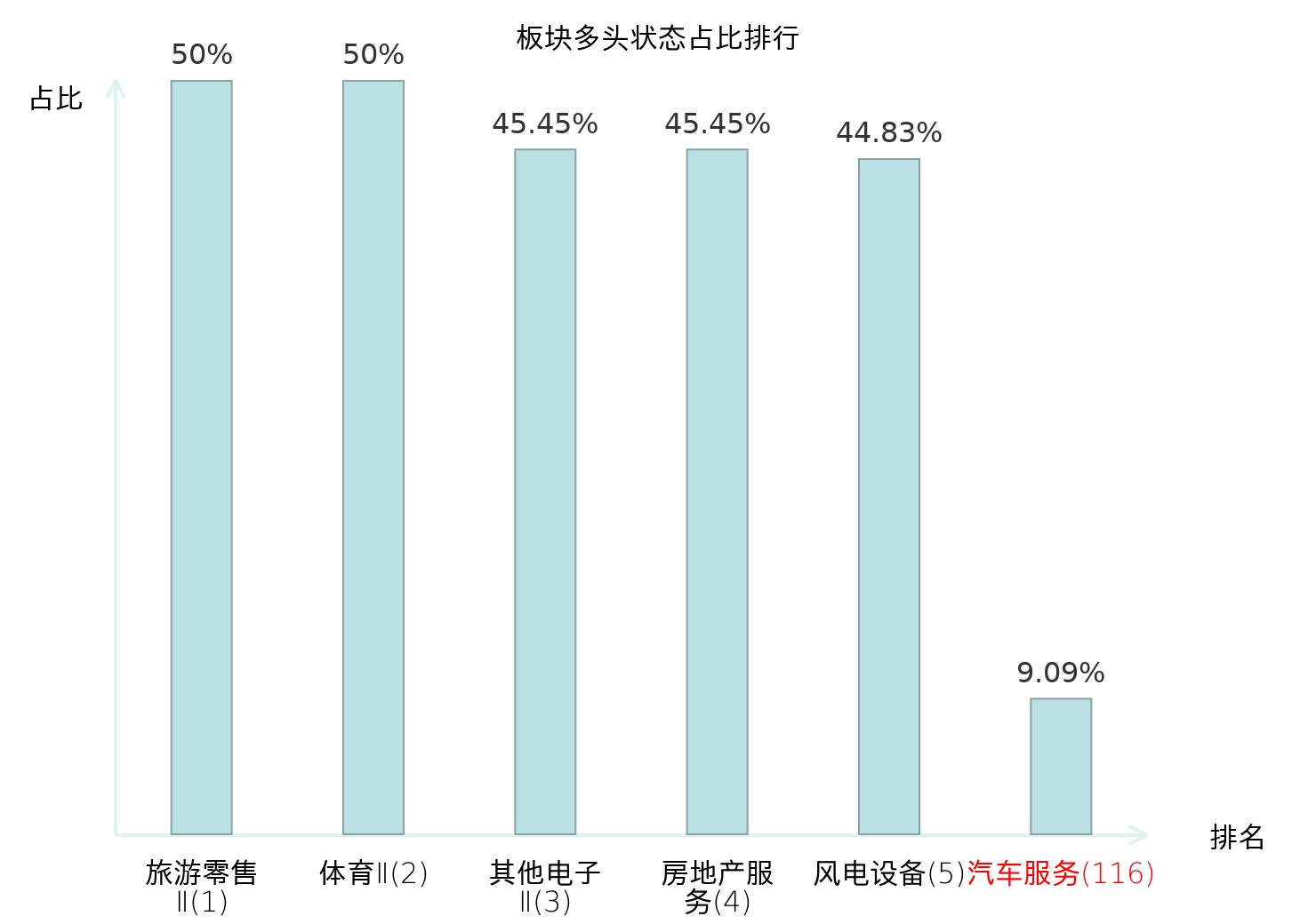 全市场所有行业板块中主力多头状态占比排名中,旅游零售Ⅱ板块位居第一。其他家电Ⅱ板块名次提升最快,较昨日上升112位。