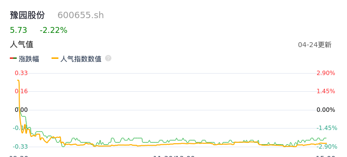 04月24日,豫园股份收报5.73,股价涨幅-2.22%,成交金额1.70亿元,换手率0.77%。