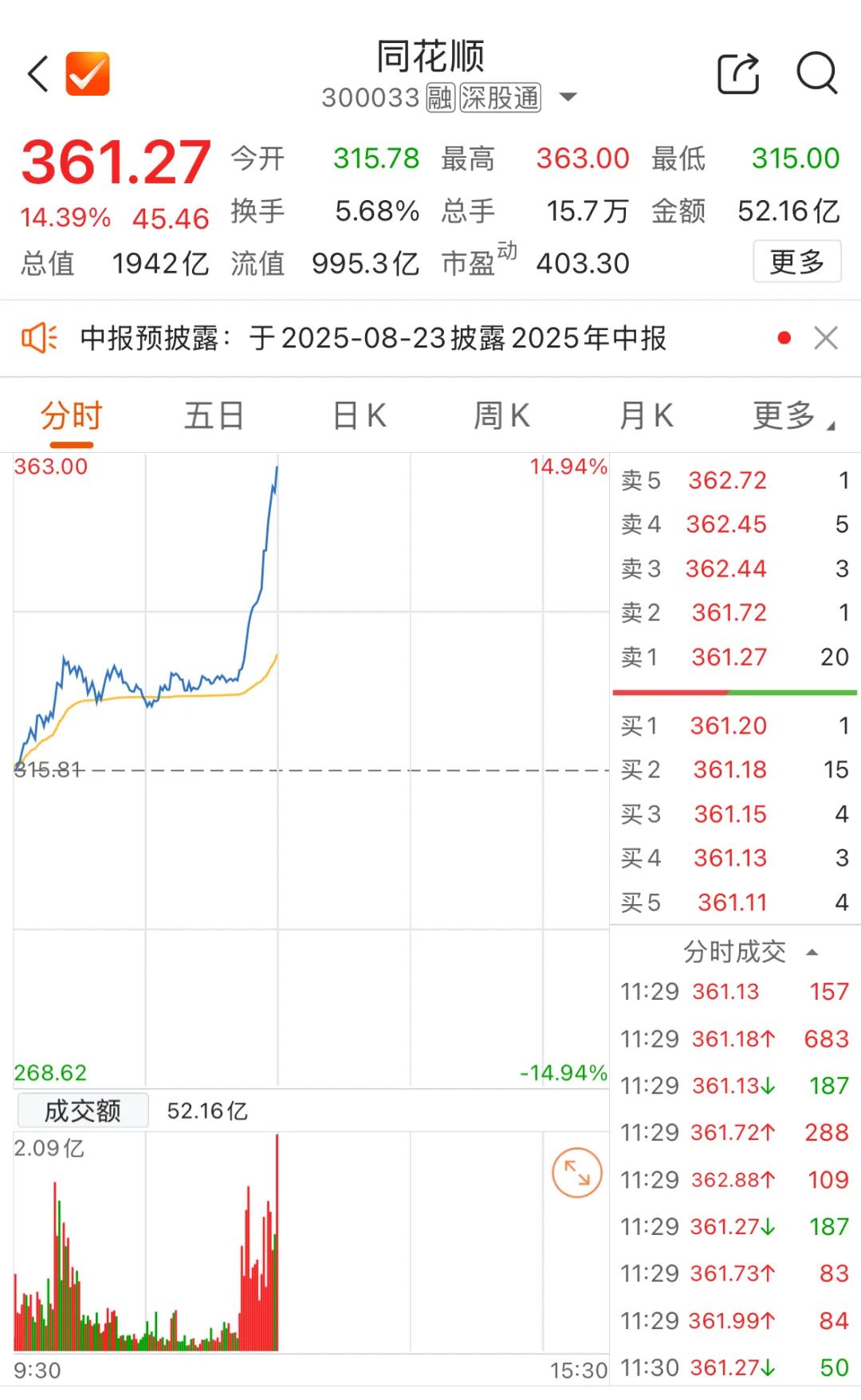 此外,距离收盘前20分钟左右,大智慧同花顺指南针三只股票股价迅速拉升,截至午间收盘,大智慧涨9.98%,同花顺涨14.39%,指南针涨16.23%。