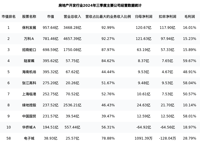 电子城最新报告期数据为三季度,下表汇总了房地产开发行业内市值靠前的公司三季度主要经营数据
