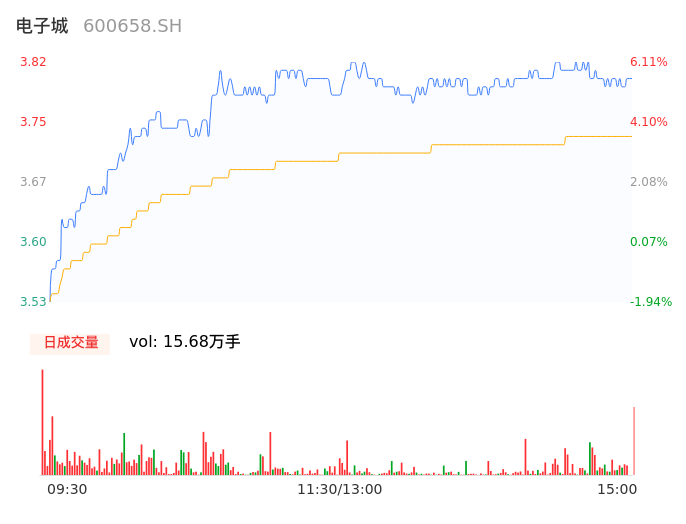04月29日,电子城收报3.80,股价涨幅5.56%,成交金额5857.28万元,换手率1.40%。