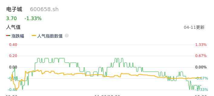 04月11日,电子城收报3.70,股价涨幅-1.33%,成交金额2963.02万元,换手率0.71%。