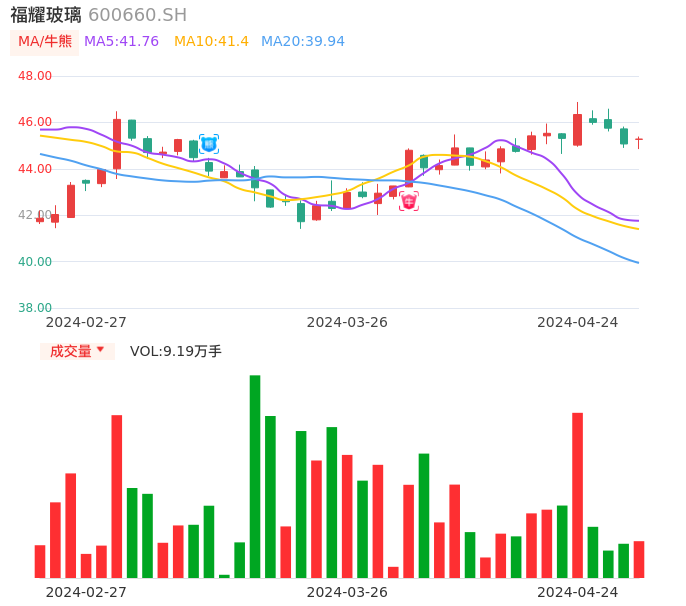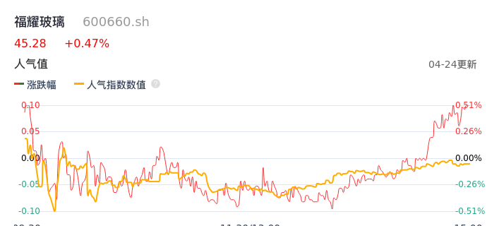 04月24日,福耀玻璃收报45.28,股价涨幅0.47%,成交金额4.14亿元,换手率0.46%。