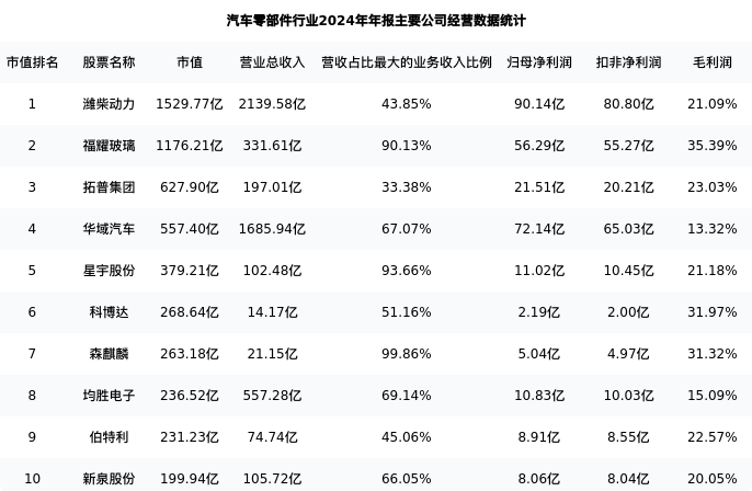 福耀玻璃最新报告期数据为年报,下表汇总了汽车零部件行业内市值靠前的公司年报主要经营数据