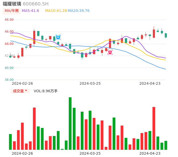 福耀玻璃在4月1日出现日线级别牛点,60分钟级别还处于熊点区间,股价还处于强势震荡区间,注意上方箱型压力位:46.48元,如不能有效突破需要谨慎乐观。