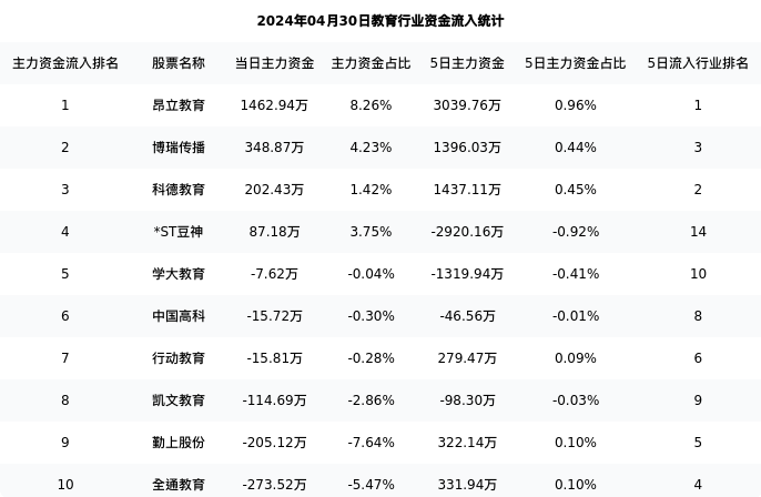 从主力资金流向来看,教育行业今日主力资金流入5.50亿元,在所有申万二级行业中排名:122/131。