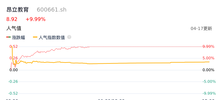 04月17日,昂立教育收报8.92,股价涨幅9.99%,成交金额8682.70万元,换手率3.51%。
