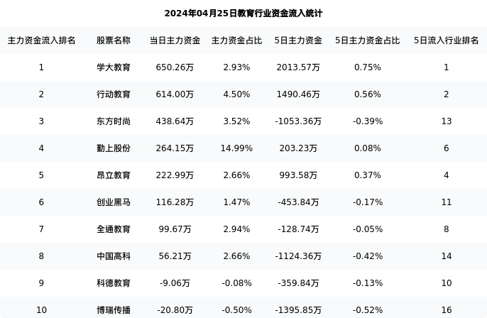 从主力资金流向来看,教育行业今日主力资金流入3.67亿元,在所有申万二级行业中排名:101/131。
