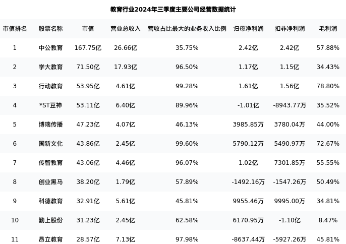 昂立教育最新报告期数据为三季度,下表汇总了教育行业内市值靠前的公司三季度主要经营数据