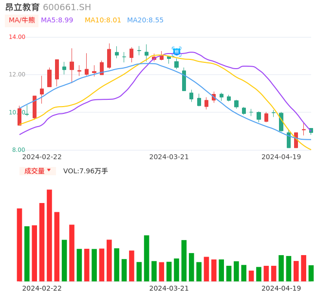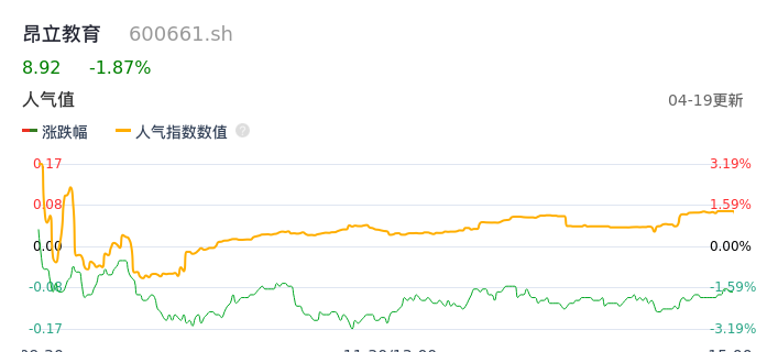 04月19日,昂立教育收报8.92,股价涨幅-1.87%,成交金额7100.08万元,换手率2.78%。