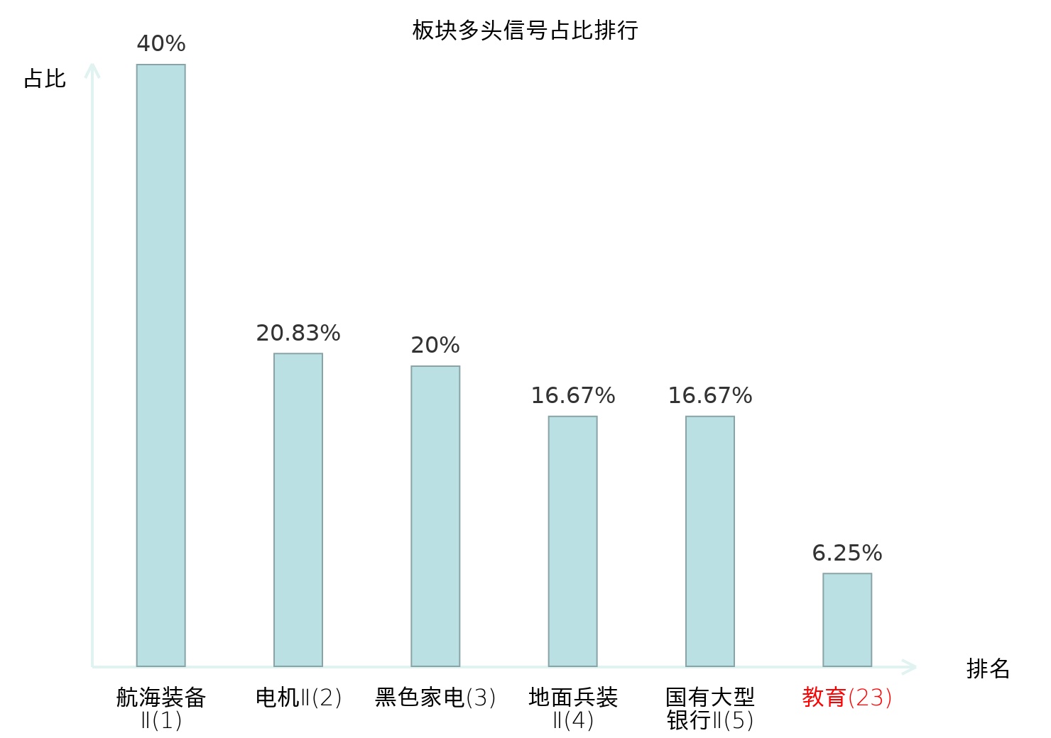 全市场所有行业板块中主力多头信号占比排名中,航海装备Ⅱ板块位居第一。国有大型银行Ⅱ板块名次提升最快,较昨日上升119位。