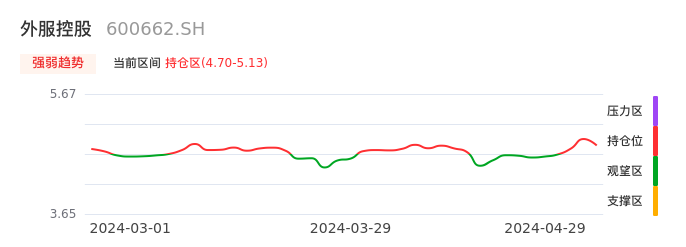 我们来看一下该股的九方特色指标强弱趋势的情况:外服控股近日从观望区上穿到持仓区。股价短期站上多头区域,但还未完全站稳。后续重点关注多空分界点的争夺:4.70元。如未能有效站稳则可能重新回到空头行情。