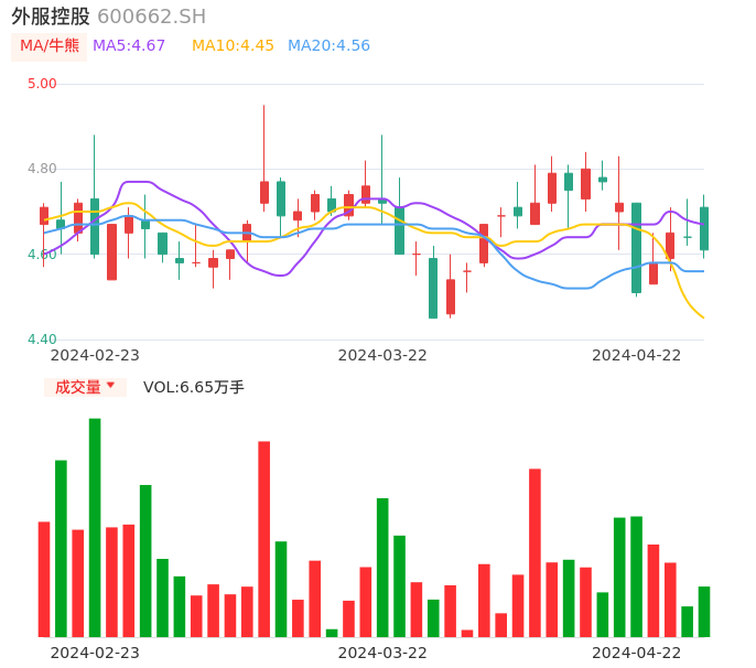 04月22日,外服控股收报4.61,股价涨幅-0.65%,成交金额3097.45万元,换手率0.63%。